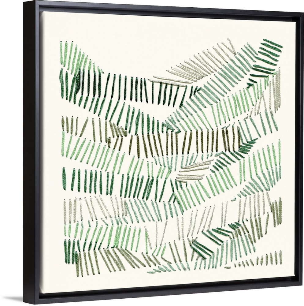 <p>Square threaded art in a lined design in shades of green that resemble bike tracks, or blades of grass.</p>
