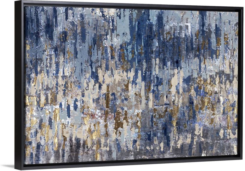 <p>A textured contemporary painting of blue and gold, giving the feeling of a distorted reflection.</p>