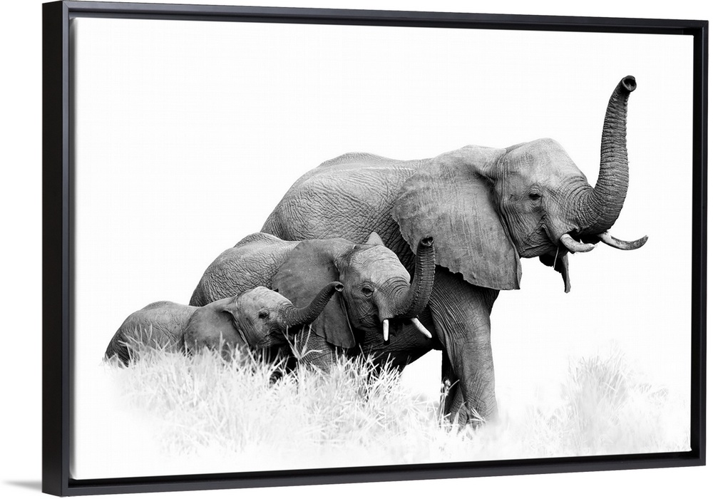 <p>Artistic, black and white photo of three African Bush Elephants, from adults to newborn calf, coming together with trunks raised.</p>