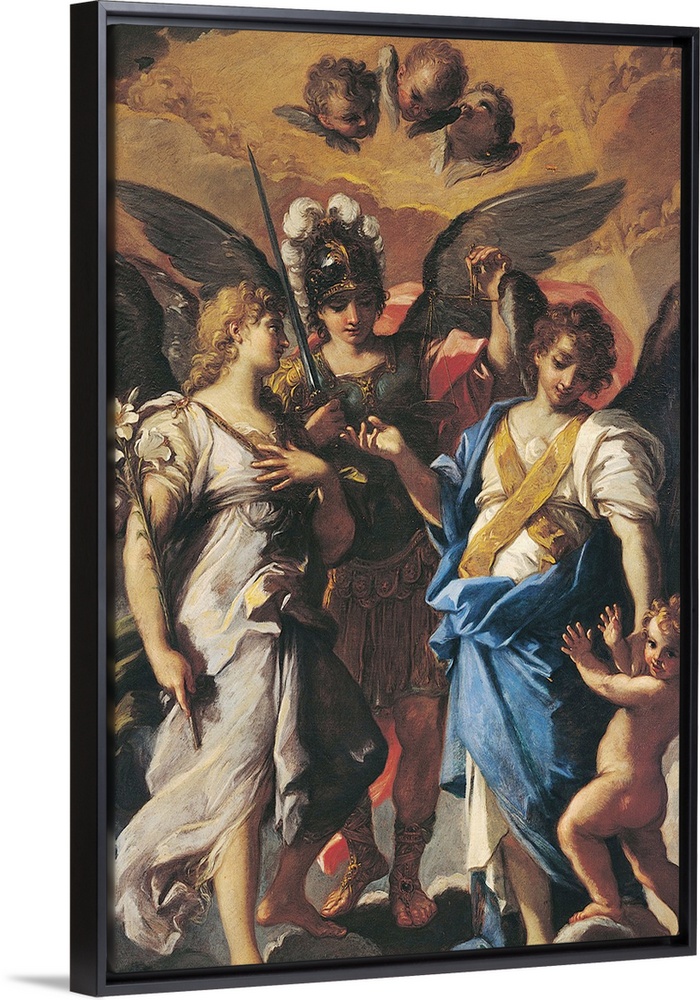 <p>The Three Archangels, by Giuseppe Passeri, 17th Century, - Italy, Lazio, Rome, Santa Caterina e Magnanapoli Church. All. Archangels Michael Gabriel Raphael putto Tobias angels cherubs seraphs wings lily helmet plume sword drapery clouds white blue gray bl</p>
