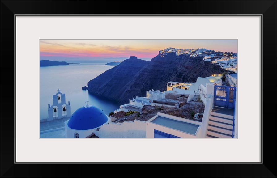 <p>Three Bells of Fira, iconic blue domed church at dusk, Fira, Santorini (Thira) Island, Cyclades, Greek Islands, Greece, Europe</p>