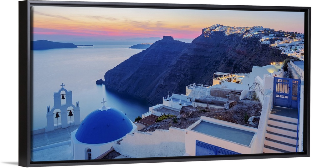 <p>Three Bells of Fira, iconic blue domed church at dusk, Fira, Santorini (Thira) Island, Cyclades, Greek Islands, Greece, Europe</p>