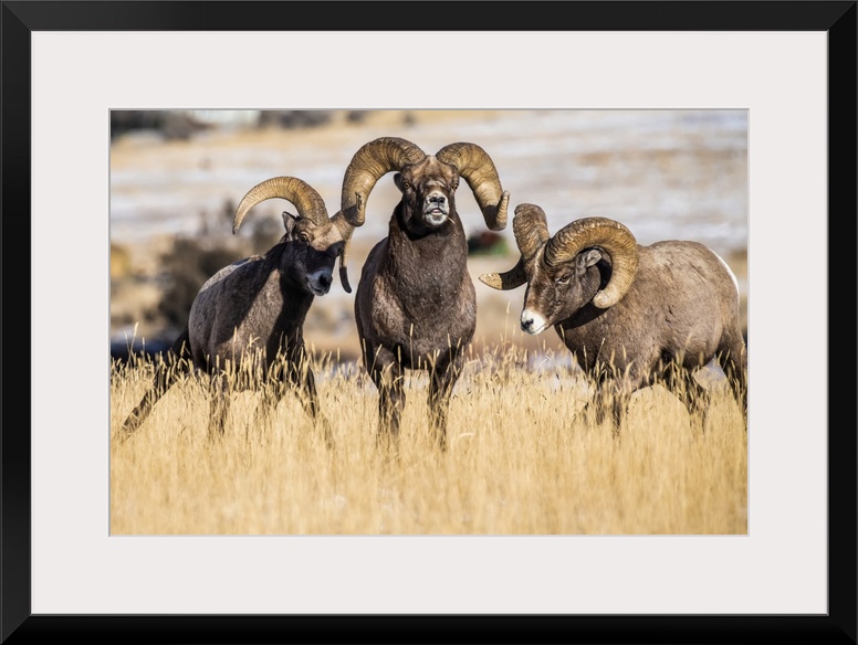<p>Three Bighorn Sheep rams (Ovis canadensis) interact with each other during the rut near Yellowstone National Park; Montana, United States of America.</p>