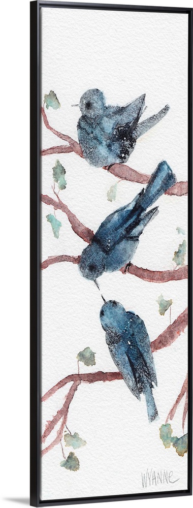 <p>Three blue watercolor birds sitting in branches.</p>