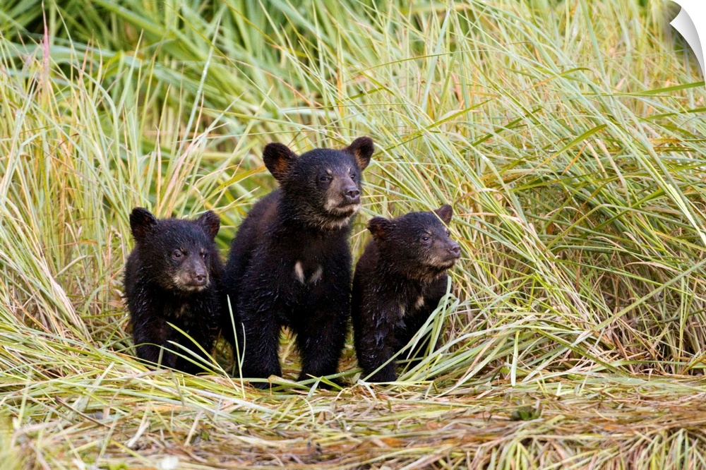 <p>Three Black bear cubs from this year's litter stand together on a grass covered creek shore as their nearby mother fishes for salmon near the Hatchery on Allison Point outside of Valdez, Alaska in summer of 2011. Southcentral Alaska.</p>