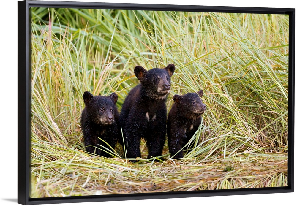 <p>Three Black bear cubs from this year's litter stand together on a grass covered creek shore as their nearby mother fishes for salmon near the Hatchery on Allison Point outside of Valdez, Alaska in summer of 2011. Southcentral Alaska.</p>