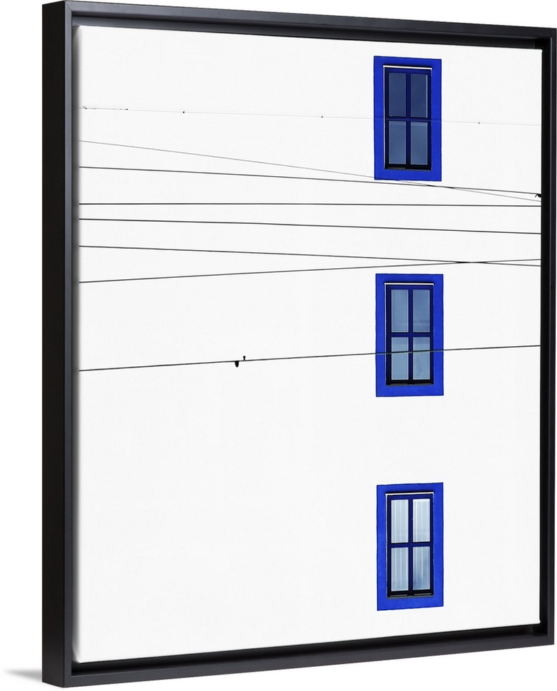 <p>The wall of a building with three windows with blue frames and intersecting power lines.</p>