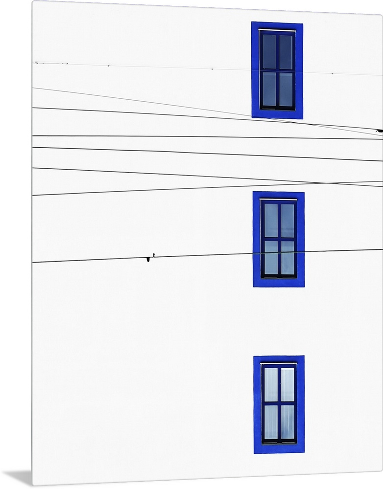 <p>The wall of a building with three windows with blue frames and intersecting power lines.</p>