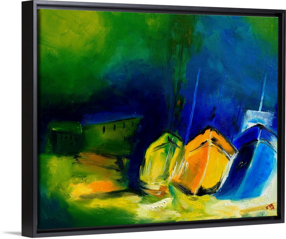 <p>A contemporary abstract painting of three boats at a dock.</p>