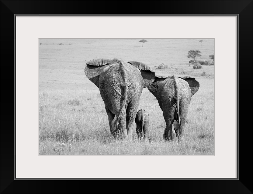 <p>A black and white photograph of an elephant family seen from behind.</p>