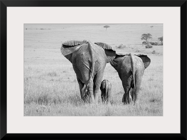 <p>A black and white photograph of an elephant family seen from behind.</p>