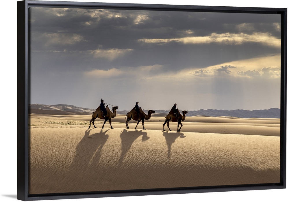 <p>Three camel herders riding their camels in the Khongor Dunes, Gobi Desert, Mongolia, Asia.</p>