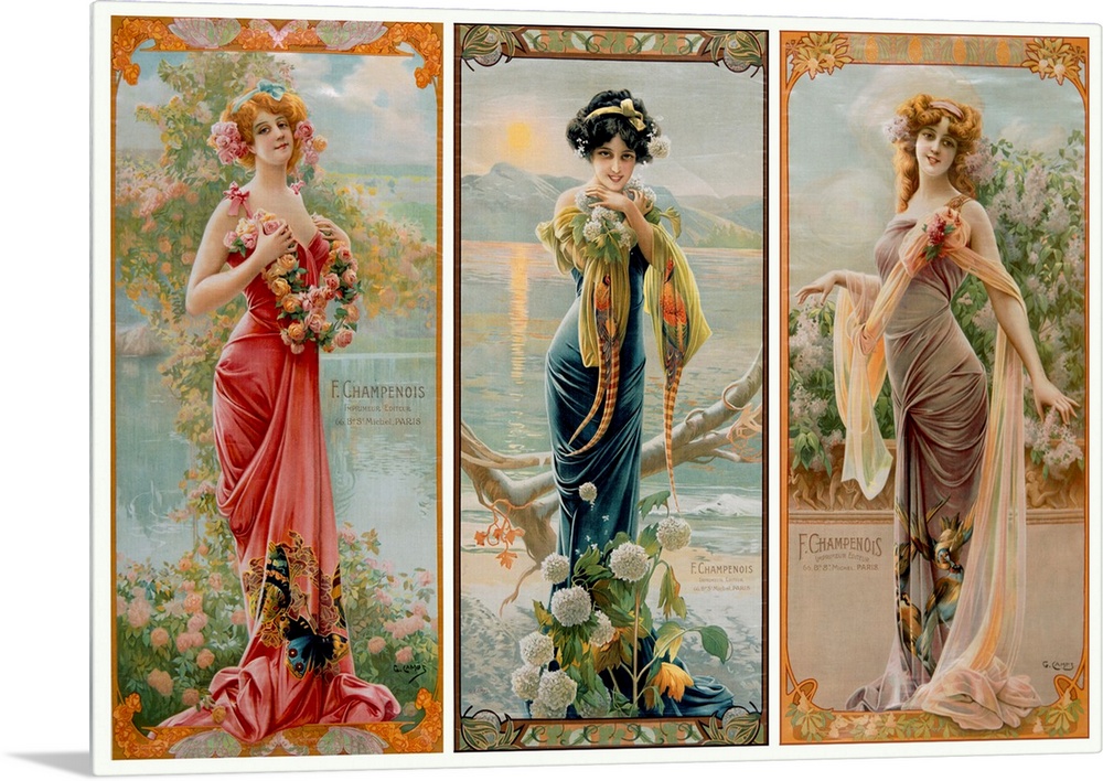 <p>Three Art Nouveau women stand in their own panels against natural backgrounds. These three exquisite Art Nouveau celebrations of beauty - female and natural - are executed with meticulous workmanship. The statuesque auburn-haired woman standing lakeside clasps a garland of pink roses against her red gown painted with butterflies. The raven-tressed beauty in teal with a pheasant-motif shawl admires white hydrangeas on the shore of a mountain lake at sunset. The blonde sylph draped in lavender with colorful birds poses in front of a carved wall lush with lilacs. Each figure's flowers and creatures appear again in the border.</p>