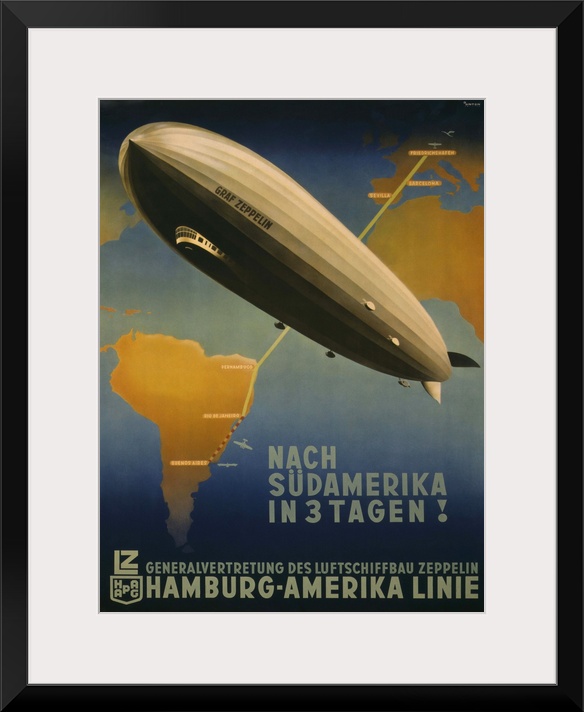 <p>Three Days to South America! Hamburg-America Line. Travel Poster promoting Graf Zeppelin route from Friedrichshafen to Buenos Aires. 1937.</p>