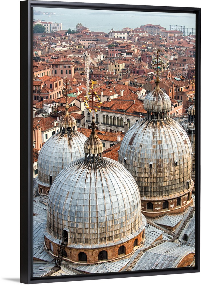 <p>Aerial view of three domes of San Marco Basilica with Venice rooftops in the background.</p>