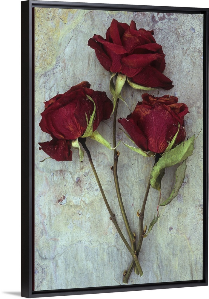 <p>Three dried deep red roses lying with their stems and leaves on marbled slate stone</p>