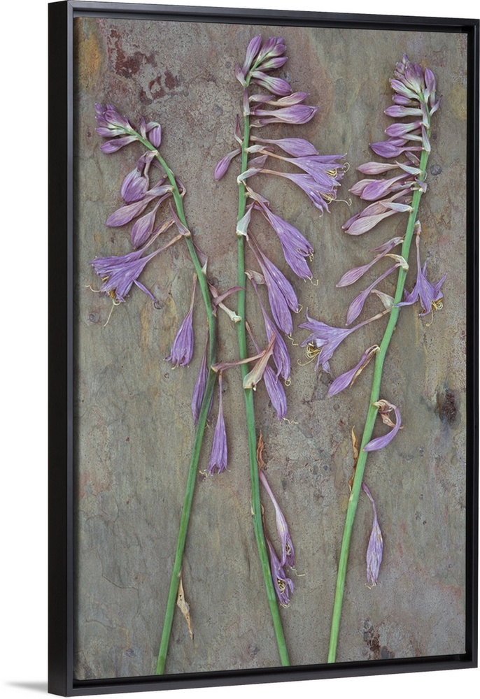 <p>Three dried stems of lilac coloured flowers of Plantain lily or Hosta fortunei Albopicta lying on marbled sla</p>
