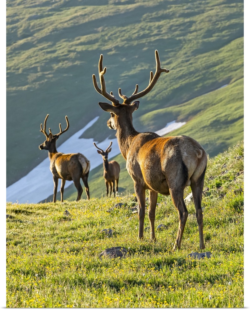 <p>Three Elk bulls (Cervus canadensis) looking down from mountainside on lush, grassy slopes to water in the valley below; Estes Park, Colorado, United States of America.</p>