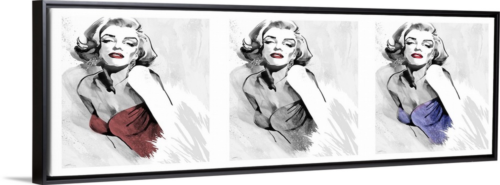 <p>Marilyn Monroe's fashion pose in black and white with red lips and a retro 1980's strapless dress in red and purple.</p>