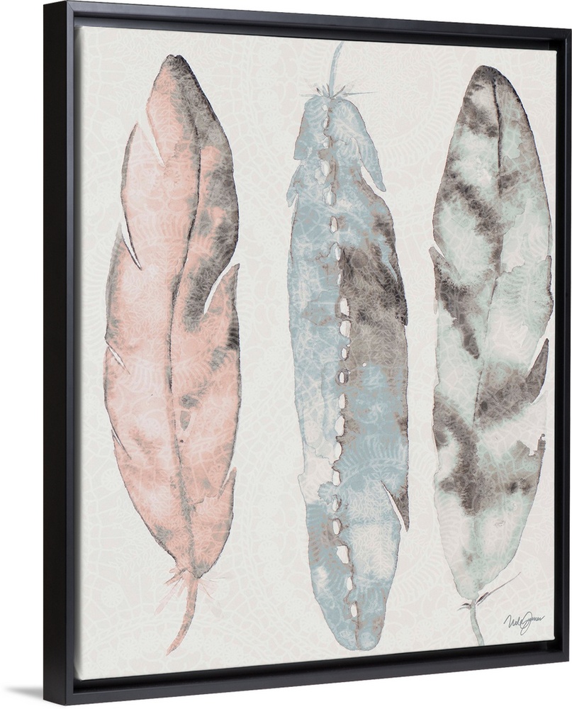 <p>Watercolor painting of three feathers in muted shades of pink, blue, and grey.</p>