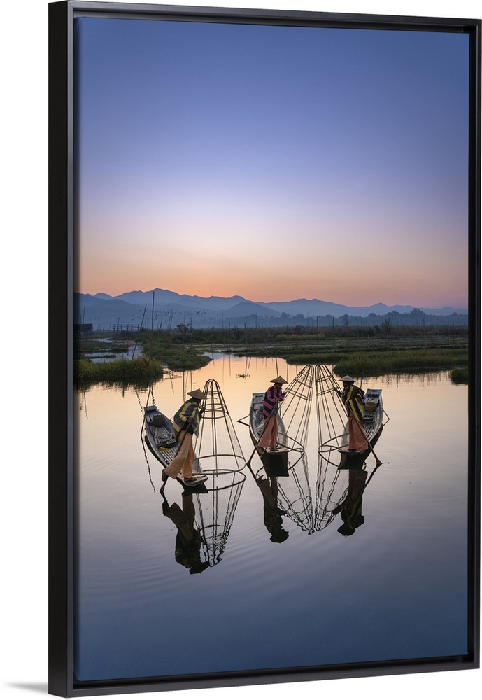 <p>Three fishermen holding typical conical nets on their boats before sunrise, Floating Gardens, Lake Inle, Nyaungshwe Township, Taunggyi District, Shan State, Myanmar</p>