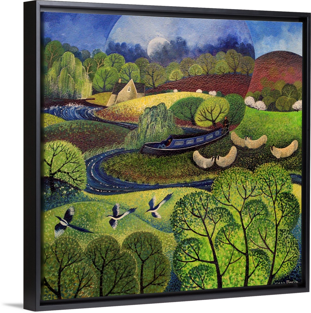 <p>Contemporary painting of three magpies flying over a lush countryside.</p>