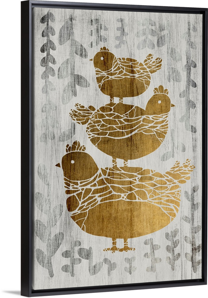 <p>Gold leaf on weathered wood with a fern pattern of three chickens.</p>