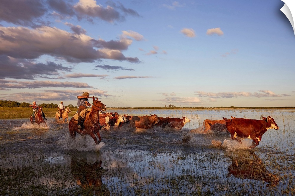 <p>Three gauchos drive a group of cows inside a lagoon of the Estancia Buena Vista at dusk, Esquina, Corrientes, Argentina.</p>
