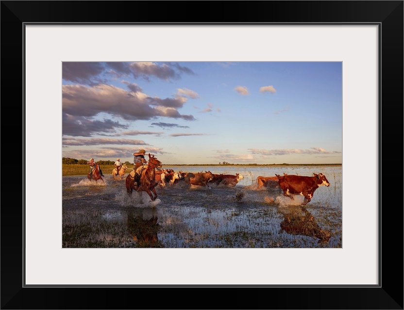 <p>Three gauchos drive a group of cows inside a lagoon of the Estancia Buena Vista at dusk, Esquina, Corrientes, Argentina.</p>