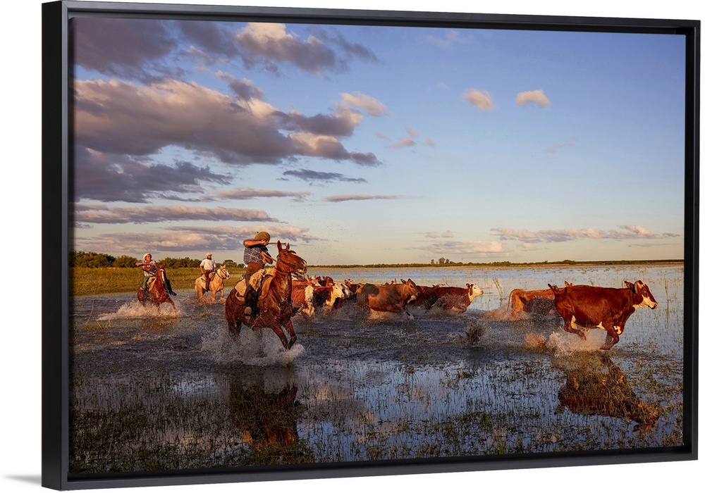 <p>Three gauchos drive a group of cows inside a lagoon of the Estancia Buena Vista at dusk, Esquina, Corrientes, Argentina.</p>