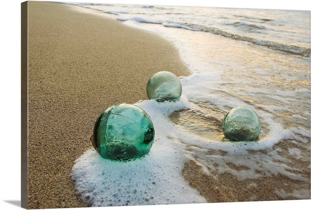 <p>Large photograph centers on a few clear pieces of fishing equipment as they have washed to shore from the gentle waves of an ocean.</p>