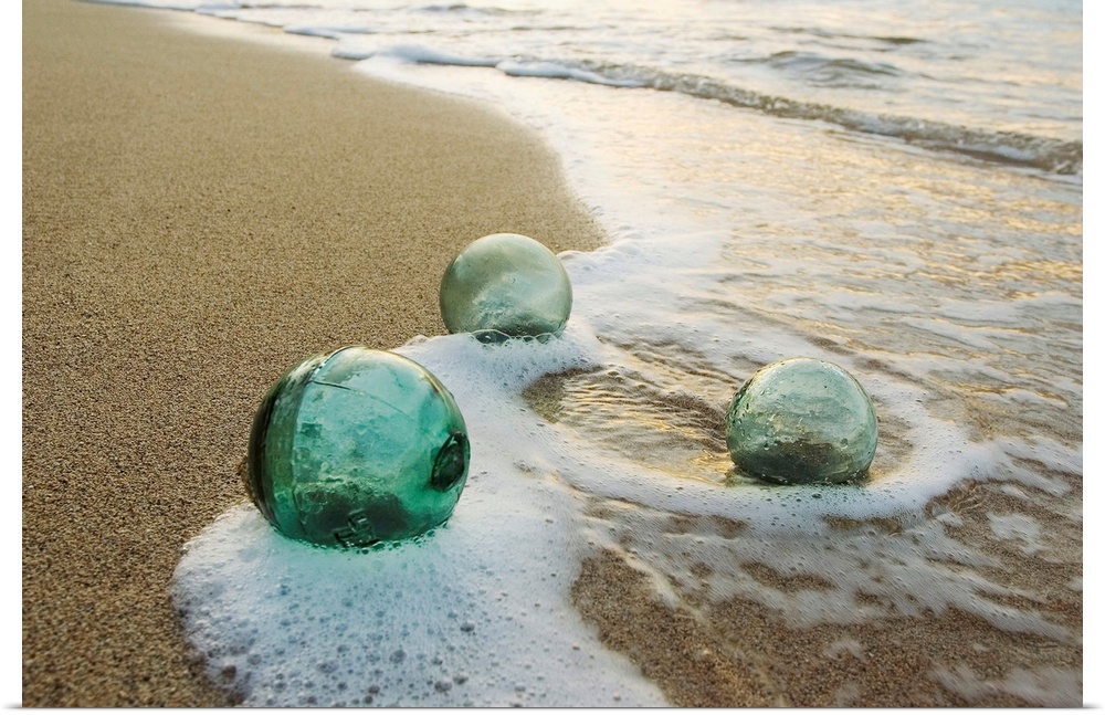<p>Large photograph centers on a few clear pieces of fishing equipment as they have washed to shore from the gentle waves of an ocean.</p>