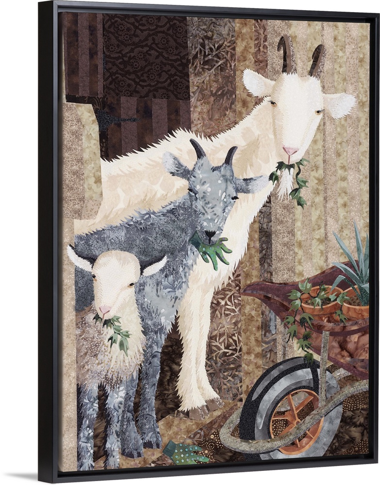 <p>Contemporary colorful fabric art of a three goats all eating.</p>