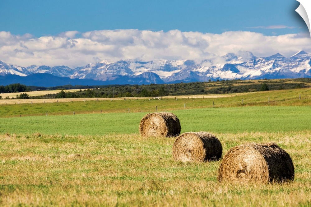 <p>Three hay bales in a field with mountains in the background slightly snow covered and cloudy with blue sky, Alberta, Canada.</p>