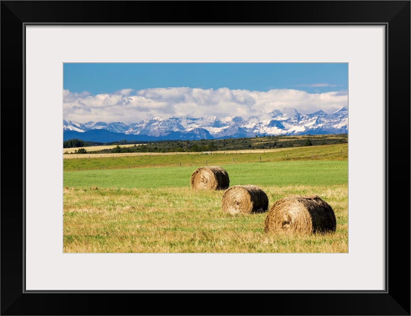 <p>Three hay bales in a field with mountains in the background slightly snow covered and cloudy with blue sky, Alberta, Canada.</p>