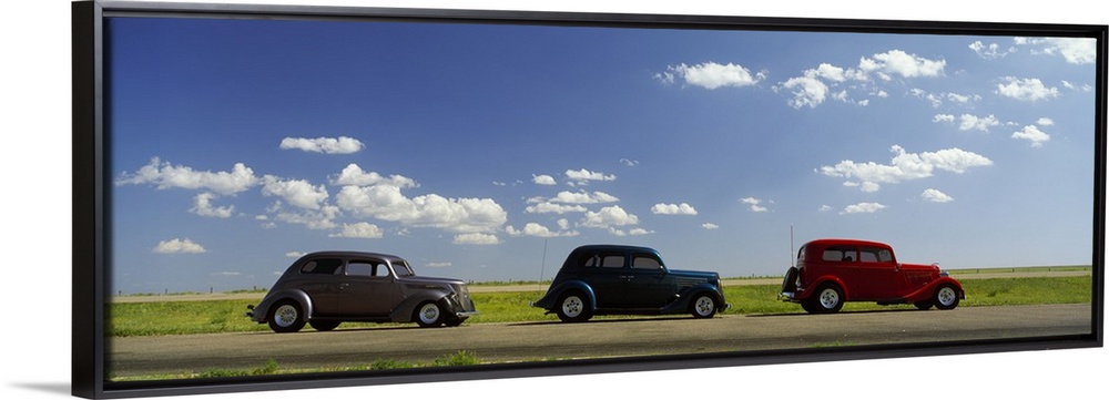 <p>Panoramic photograph of three vintage cars driving down the street under cloudy skies.</p>