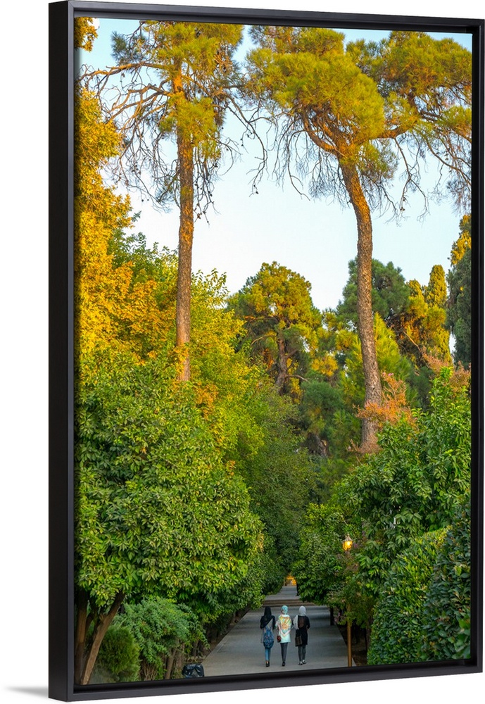 <p>Three Iranian women walking through the Bagh-e Eram (Garden of Paradise), Shiraz, Iran, Middle East</p>