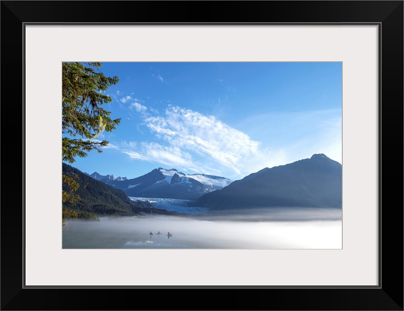 <p>Three Kayakers paddle the shoreline of Mendenhall Lake as morning fog clears, Tongass National Forest, Juneau, Alaska.</p>