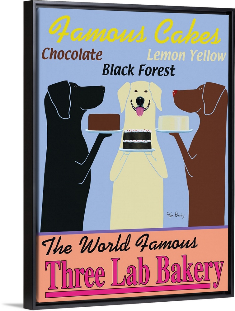 <p>Retro-style artwork of three Labrador retriever dogs, each holding a lemon, black forest, or chocolate cake.</p>