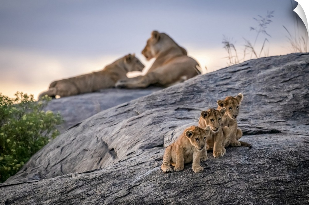<p>Three lion cubs (Panthera leo) sitting on a rock looking out with two lionesses in the background at dusk, Serengeti; Tanzania</p>