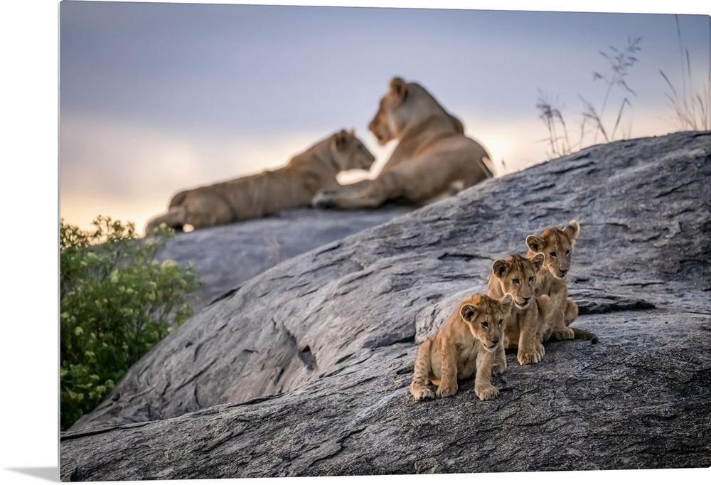 <p>Three lion cubs (Panthera leo) sitting on a rock looking out with two lionesses in the background at dusk, Serengeti; Tanzania</p>
