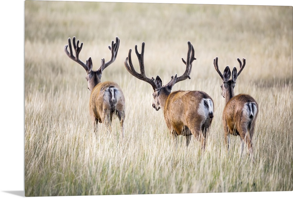 <p>Rear view of three Mule deer bucks (Odocoileus hemionus) standing in a grass field; Steamboat Springs, Colorado, United States of America</p>
