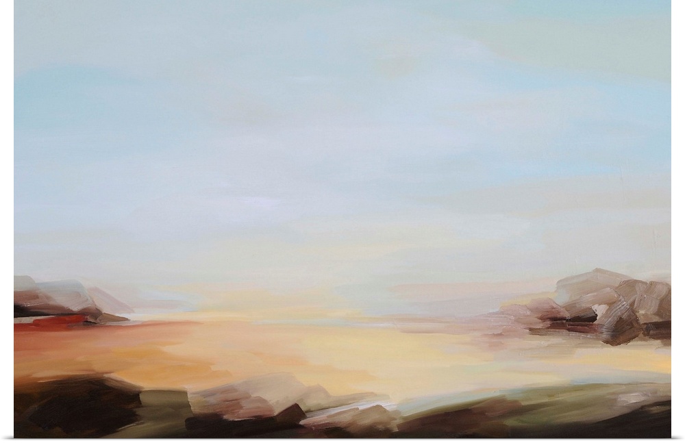 <p>A contemporary abstract painting of a landscape under a blue sky.</p>
