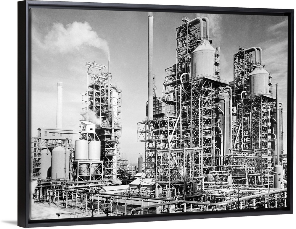 <p>Three oil refinery units in Louisiania, which use the process of 'cracking,' set up to supply fuel for allied units fighting in World War II. Photograph, c1944.</p>