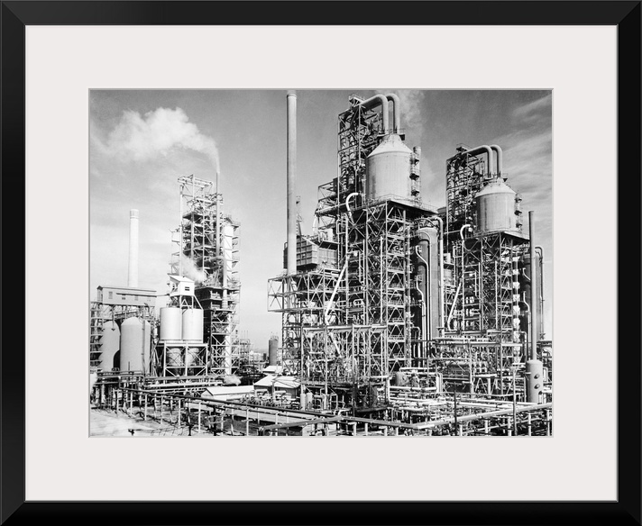 <p>Three oil refinery units in Louisiania, which use the process of 'cracking,' set up to supply fuel for allied units fighting in World War II. Photograph, c1944.</p>