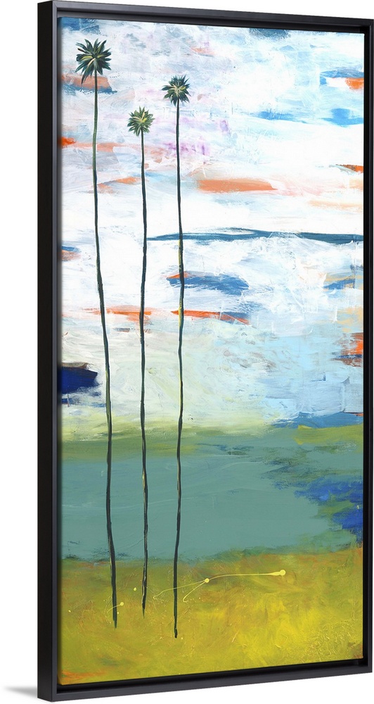 <p>A contemporary abstract painting of three palm trees in a row with long and exaggerated tree trunks and a colorful background.</p>