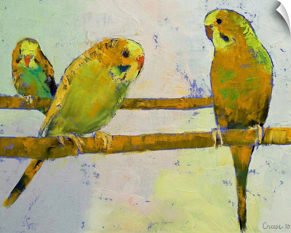 <p>Original oil on canvas painting of three budgies on perches by American artist Michael Creese.</p>