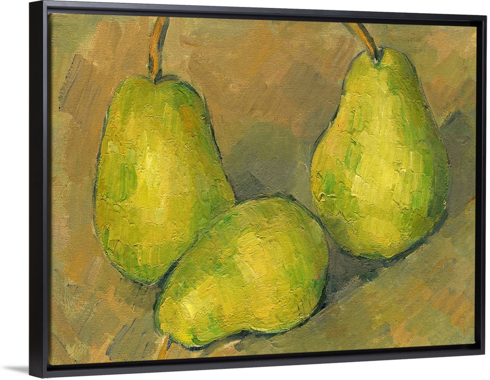 <p>Three Pears, by Paul Cezanne, 1878-79, French Post-Impressionist painting, oil on canvas. Entering his mature period, he did not model the pears by blending paint from dark to light. Instead, Cezanne gave them form with distinct patches of colors</p>