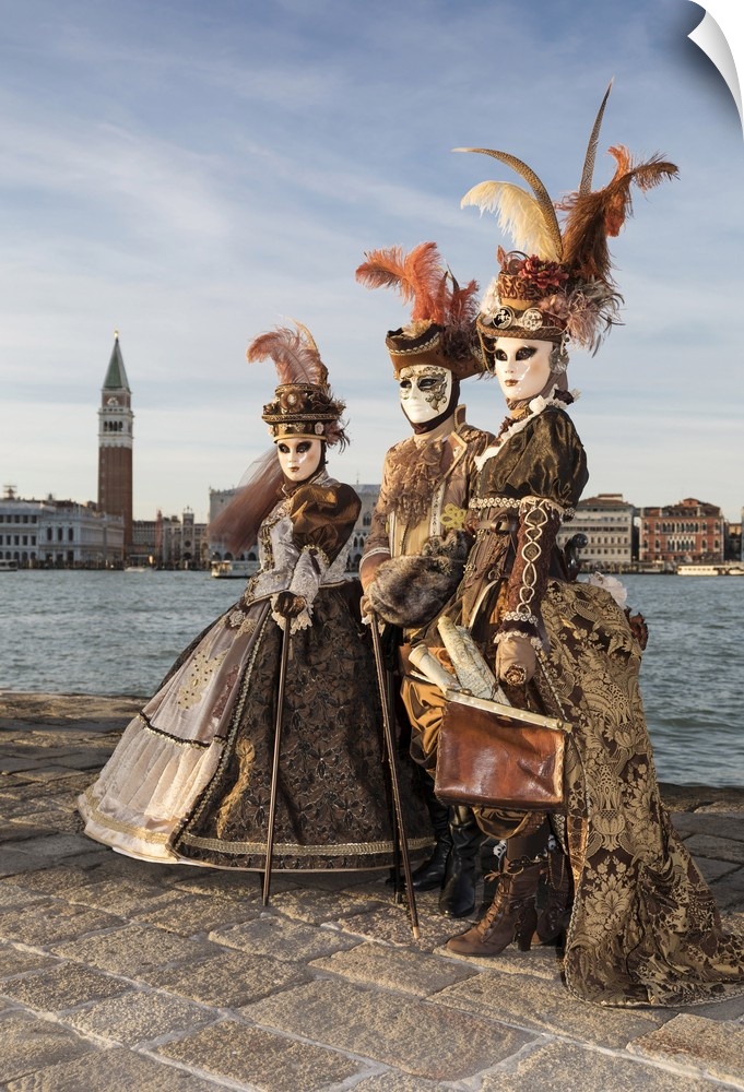 <p>Three people in costume at Carnival time, San Giorgio Maggiore, Venice, Veneto, Italy</p>