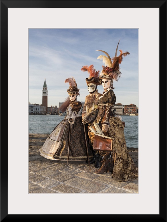 <p>Three people in costume at Carnival time, San Giorgio Maggiore, Venice, Veneto, Italy</p>